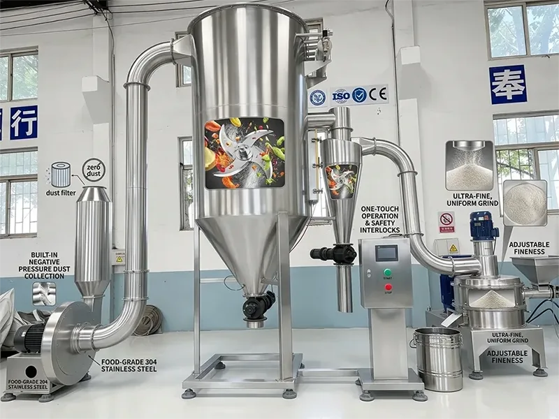 4. Hjælpestruktur: Indbygget undertryksinduceret træksystem, der ikke flyver støv under knusningsprocessen, hvilket effektivt opretholder et rent driftsmiljø; Udledningsporten kan tilsluttes direkte til opsamlingsanordningen for at opnå hurtig pulveropsamling og minimere materialetab; Bunden af Fruit Vegetable Ultrafine Pulverizer er udstyret med skridsikre fodpuder, som giver fremragende stabilitet under drift og effektivt reducerer støjinterferens, hvilket skaber et behageligt driftsmiljø.