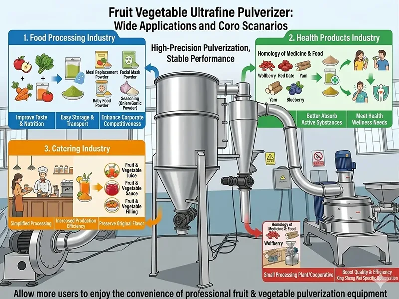 4. Husholdnings- og lille forarbejdning: Den lille størrelse Frugtgrøntsag Ultra Fin Pulverizer er velegnet til hjemmebrug og kan knuse forskellige frugter og grøntsager efter personlige behov, lave hjemmelavet frugt- og grøntsagspulver, babymad osv. Den er sikker, hygiejnisk og nem at betjene; Samtidig er den velegnet til små forarbejdningsanlæg og kooperativer. Xingshengwei optimerer udstyrsdesign til små forarbejdningsscenarier, balancerer praktisk og økonomi og hjælper med at forbedre kvalitet og effektivitet i små batch-produktioner, hvilket giver flere brugere mulighed for at nyde den bekvemmelighed, som professionelt frugt- og grøntsagsknuseudstyr giver.