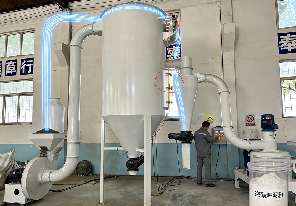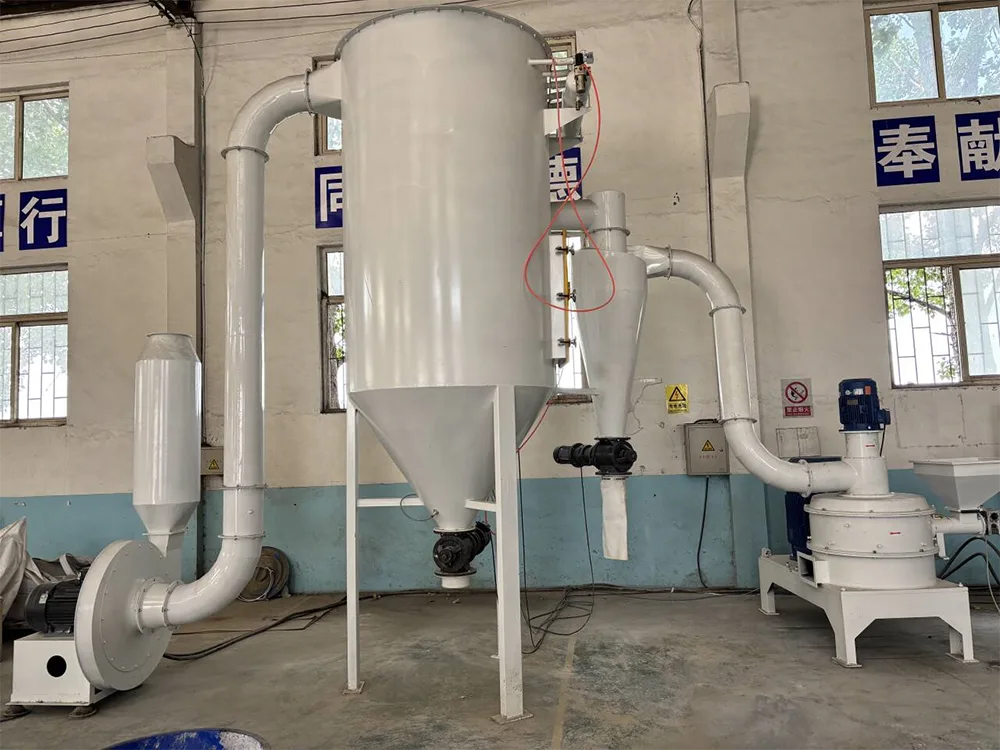 Efter at materialet er knust, opdeles det i grove og fine kvaliteter af et højhastigheds roterende sorteringshjul drevet af negativ trykluftstrøm. Tykkelsen af materialet styres af sorteringshjulets hastighed. Et styredæksel er monteret uden for sorteringshjulet i maskinens hulrum. Det grove materiale falder efter at være klassificeret af sorteringshjulet tilbage til knuseskiven gennem styredækslet for yderligere knusning. Efter at knusningsfinheden er nået, kommer den ind i sorteringshjulet gennem undertryk gennem ydersiden af styredækslet til sortering, hvilket undgår den gensidige påvirkning af materialeluftstrømmen og tillader materialet at blive knust gentagne gange. Dette opnår engangsknusning og sortering, hvilket i høj grad forbedrer produktionskapaciteten og reducerer energiforbruget.