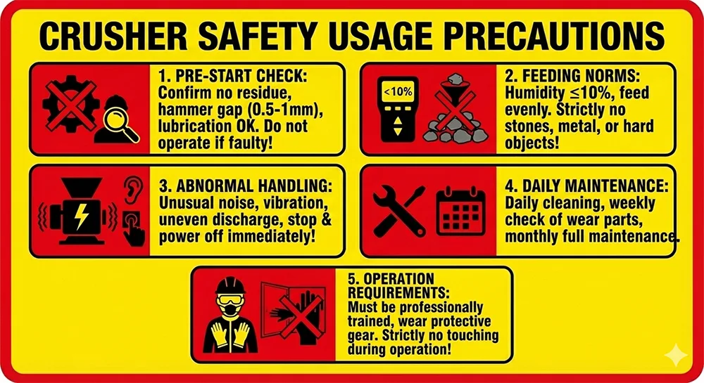 Undtagelseshåndtering: Når udstyret kører, hvis der er mærkelige lyde, kraftige vibrationer eller forskellige tykkelser af knuste materialer, skal det stoppes med det samme, og strømmen skal afbrydes. Tjek først, om hammeren er slidt, eller om sorteringshjulet er blokeret. Når du har løst problemet, skal du genstarte maskinen.
